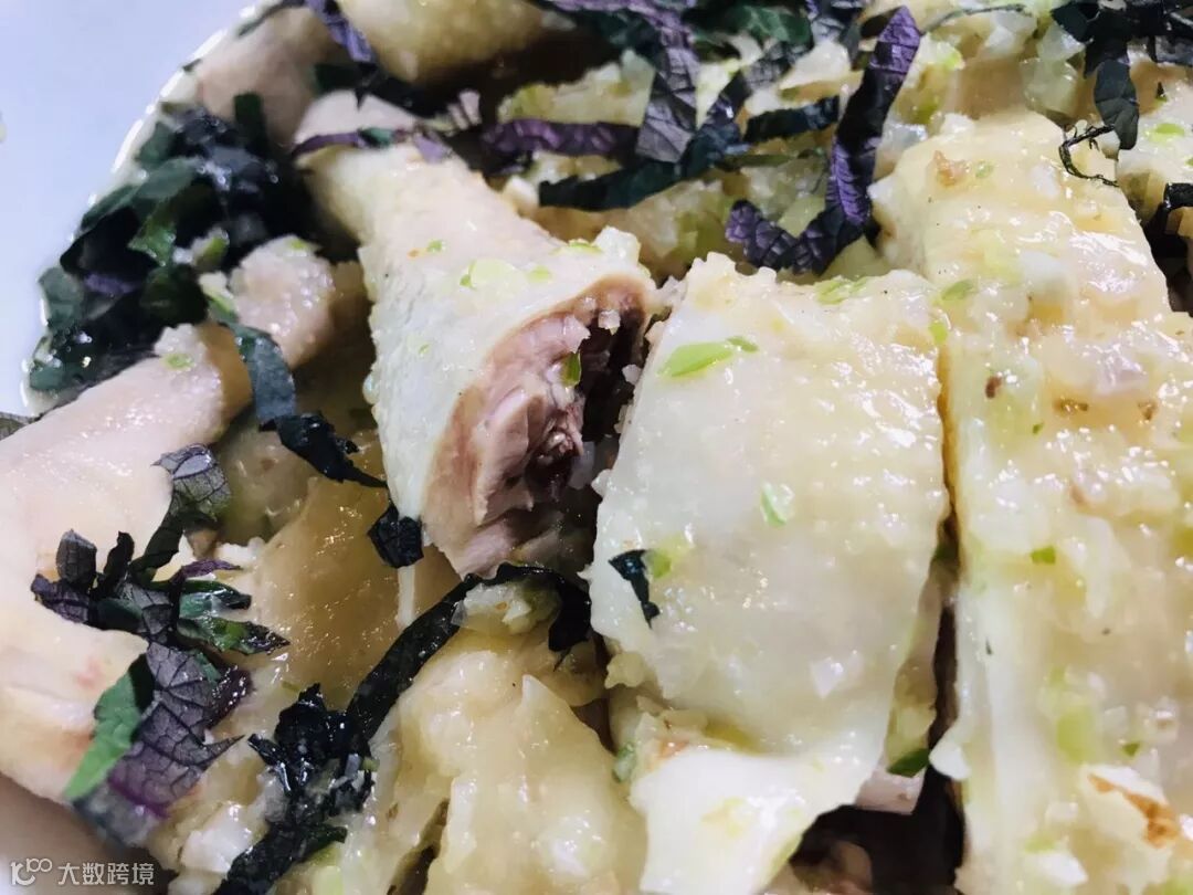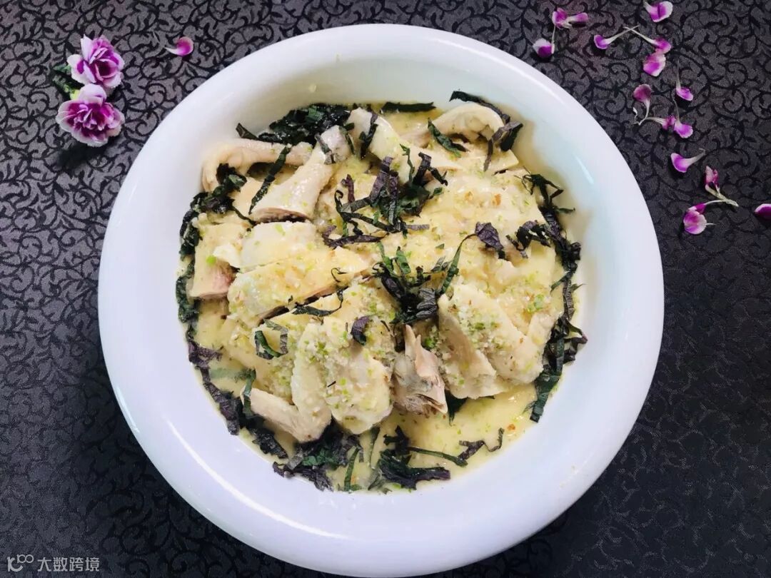 紫苏叶中富含钙质,有镇咳平喘、祛痰的功能。其气清香,自古就有紫苏入宴的做法。沙姜鸡肉质紧实嫩滑,沙姜做出的姜蓉和姜油在肆意挥发着自身味道的同时,又衬托了鸡肉的浓郁肉香,再配上紫苏的独特的香气,一个字,正!