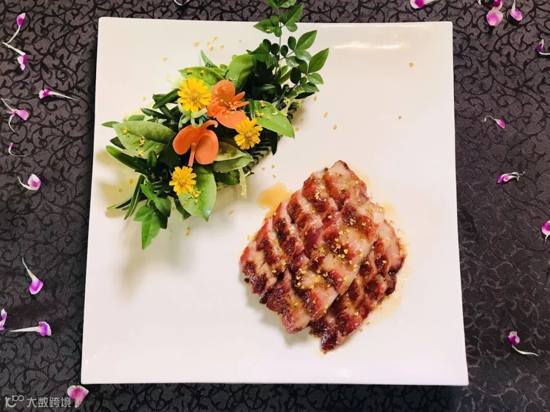晶莹剔透的五花肉,富有弹性的脂肪层之间夹着精瘦却肉香四溢的瘦肉,肥瘦相间,恰到好处。慢慢咀嚼,结构被破坏了的脂肪层瞬间化作油脂,油香在口腔中蔓延,肥而不腻;还带着阵阵清新的玫瑰花香,新奇又解腻。