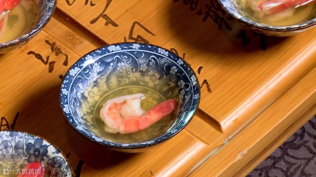 用功夫茶方式沏出来的茉莉花茶,清香中带点微涩的口感,把剥好的鲜甜的虾肉放入其中。沐浴在茉莉花茶中的虾,从外到里都散发着茉莉花的清香,虾肉本身的鲜甜也不减半分,虾肉的味道也渗透到花香当中。最后在花茶当中加入少许的鸡汤提鲜,整道菜又增添了一份滋味。
