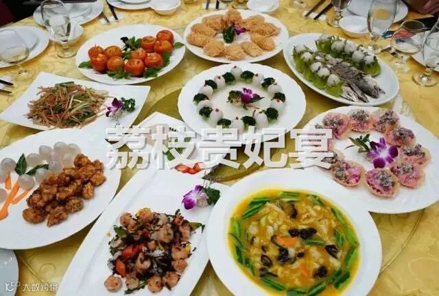 荔枝贵妃宴参考菜单:荔枝干炖鸡汤、荔枝柴烧鸡、双味荔枝虾、荔枝园河鱼、荔香腩肉、荔园家乡小炒肉、荔枝田马蹄粒、荔枝蜜桂花糕、荔枝木耳花、荔枝园甜麦