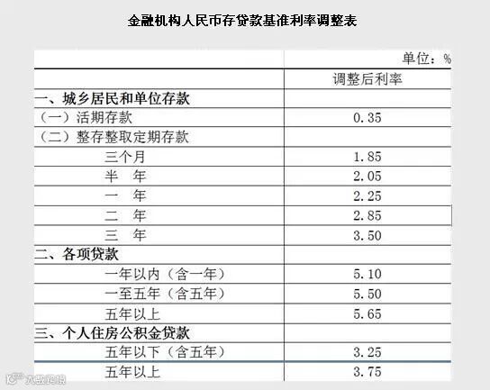 中国人民银行决定,自2015年5月11日起下调金融机构人民币贷款和存款基准利率。金融机构一年期贷款基准利率下调0.25个百分点至5.1%;一年期存款基准利率下调0.25个百分点至2.25%,同时结合推进利率市场化改革,将金融机构存款利率浮动区间的上限由存款基准利率的1.3倍调整为1.5倍;其他各档次贷款及存款基准利率、个人住房公积金存贷款利率相应调整。