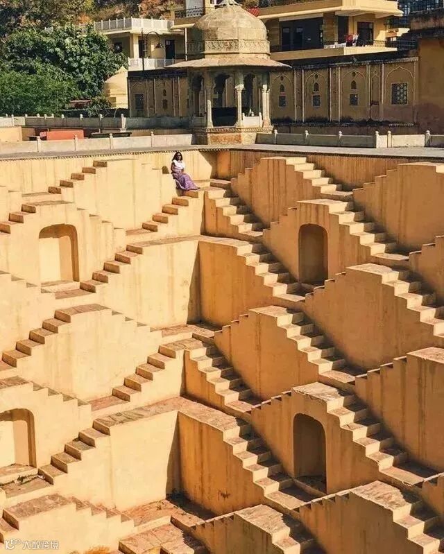 月亮水井位于斋普尔附近的艾芭奈丽(Abhaneri),建于10世纪,至今已经1200多年了,是全印度最深的阶井。井深30多米,共有13层,3500台阶之多。形状像是一个倒梯型的金字塔,整个建筑往里收,中间完全沒有隔间,直通地底。