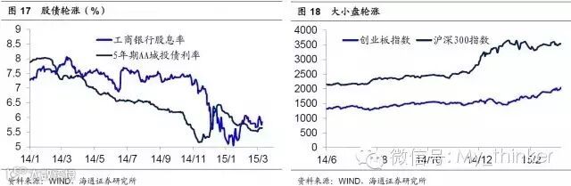 由于增量资金的不停进入,因而我们观察到14 年以来大类资产出现了轮涨:首先是在债券和股票类资产之间的轮涨。14 年前11 个月债券暴涨,5 年期AA 城投债利率从8%降至5%,而当时以工行为代表蓝筹股息率高达7.5%,因而存在着极大的补涨动力。而后来的两个月之内其股价暴涨了50%,股息率从7.5%降至5%。其次是资产内部的轮涨,比如股市在去年11、12 月大盘蓝筹暴涨,到了今年以来创业板接力大涨。而债市在去年以来也一直呈现从高收益到高等级债券之间的轮涨。