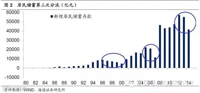 从居民储蓄角度看,在历史上曾经出现过3 次分流,最早一次是97 年到2000 年,第二次是在06、07 年,而13 年以来出现了第三次分流的趋势,而在14 年这一趋势愈发的明显,新增居民存款仅4 万亿,已经低于过去6 年的最低值。