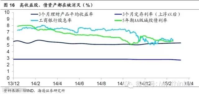 由于理财可以在股债之间灵活切换,其客户资金成本在5%左右,再考虑其管理费用,需要配臵收益率在6%以上的资产。而在去年年初,以工行为代表的蓝筹股息率以及以5年期AA 级城投债为代表的债券收益率都在8%左右,经过这一轮股债大牛市之后,基本上这两类资产的分红收益率都降到了6%左右,和5%左右的理财成本基本相当。