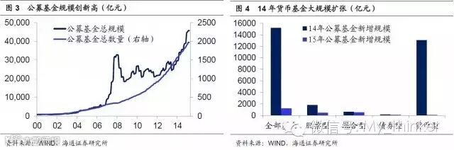从基金角度观察,14 年公募基金规模创出历史新高,接近4.5 万亿,当年新增1.5万亿,其中主要的增量来自于货币基金,14 年货基新增规模达到1.3 万亿,目前货基已经占据了公募基金的半壁江山。