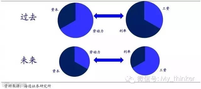 我们可以从要素禀赋角度解释为什么劳动力减少会带来利率下降:过去劳动力充裕,因而劳动力工资便宜;反过来资本稀缺,因而要素分配也向资本倾斜,体现为利率居高不下。而未来随着资本的过剩、劳动力的稀缺,要素分配必然向劳动力倾斜,而资本的相对回报率将趋于下降。