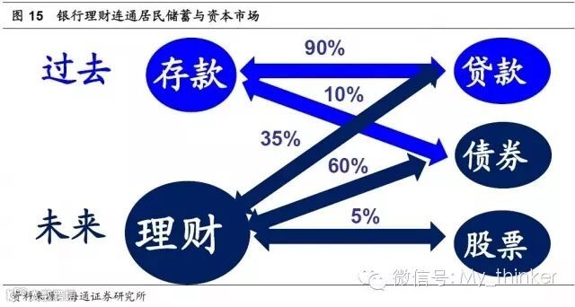 过去存款为王的时代,银行表内资金的90%左右投向贷款,剩余10%左右买债券,和股市完全绝缘。但在银行理财为王的时代,著名的8 号文只规定理财配臵非标资产比重不能超过35%,反过来意味着其65%以上的资金都必须配臵在标准化资产,包括股市和债市,因而银行理财打通了居民储蓄和股市,其对债市的配臵比例也远高于存款为王的时代。