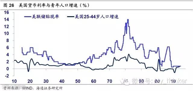 美联储成立于1914年,观察美联储官方基准利率走势,我们发现过去的100年可以大致分为3个周期,每隔30年左右变动一次方向。而这一官方利率走势与美国25-44岁青年人口增速的走势高度一致。这意味着从长期来看人口结构变化是影响利率走势的最关键因素,随着人口红利拐点的出现,零利率是长期趋势,和央行的政策取向无关。