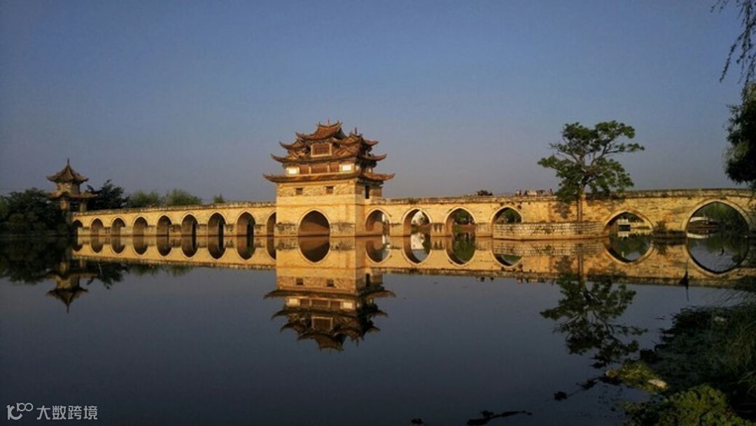 十七孔大石拱桥,它坐落于建水古城城西5里处,横跨泸江与塌冲河交汇之水面上,是云南省著名古迹之一,已列入中国造桥史册。清乾隆年间先建三孔,道光年间又建十四孔与之相连,因此俗称 "十七孔桥"。