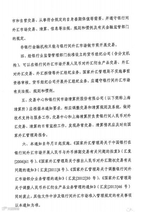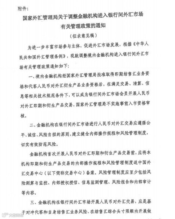 目前外汇局已就该计划向相关机构下发了《国家外汇管理局关于调整金融机构进入银行间外汇市场有关管理政策的通知》(征求意见稿)。