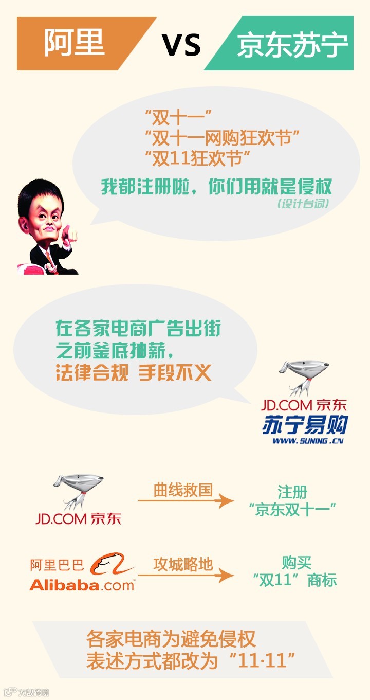“双十一”网购节是阿里巴巴于2009年创立的概念,在电子商务风起云涌之际切中要害,大获成功。依据法律,阿里巴巴对商标予以注册并加以保护,本无可厚非。但在前五个“双十一”网购节中,京东、苏宁易购亦不遗余力加入降价促销和宣传的大军,群英荟萃之际,才让“光棍节”的概念迅速走俏。如果没有其他电商加入战团,群口相声只是单口相声而已,“双十一”的概念不会有今天的影响力。