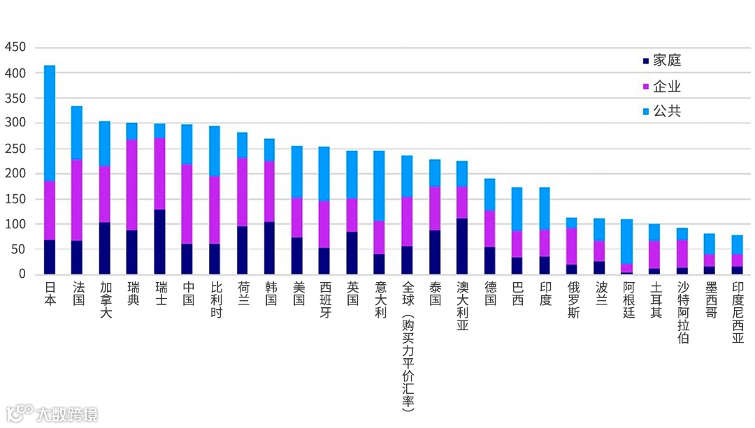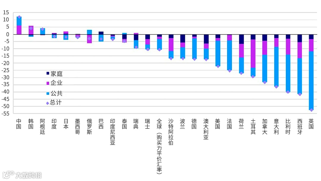 注:基于年末本币非金融部门债务与 GDP 之比。“全球(PPP)”使用国际清算银行“所有报告国家”数据,使用PPP汇率(它基于比图表中更大的国家样本)。这一变化的计算方法是2022年底债务与 GDP 之比减去2021年底的债务与 GDP 之比。截至 2019 年,按 GDP 计算,图中显示的国家排名全球前 25 位。