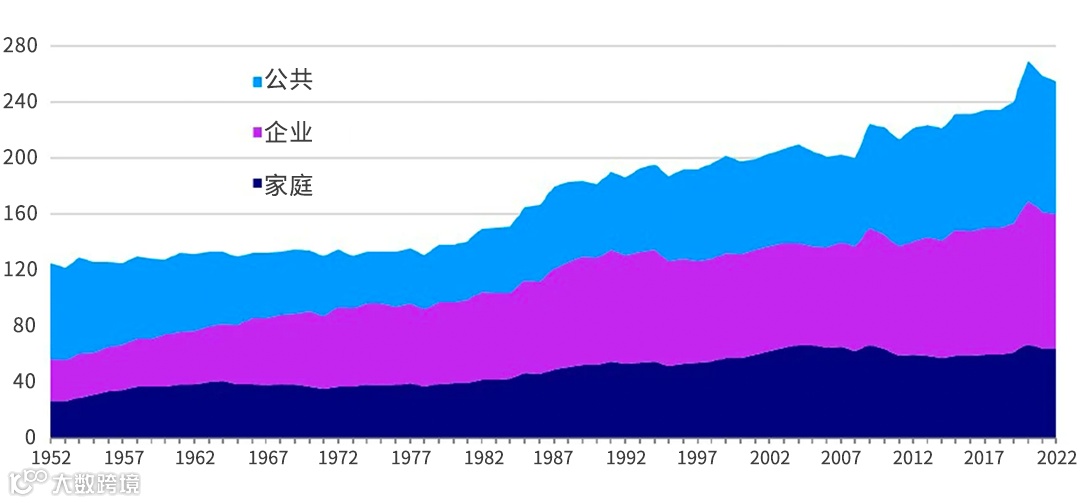 注:基于全球 25 个最大经济体的年度数据(截至 2019 年)。无法获得所有 25 个国家在整个研究期间的数据。从 1952 年的美国开始,该数据集的基础是国家数量的不断增加,直到 2008 年,所有 25 个国家都被纳入所有类别。所有国家的数据均使用市场汇率转换为美元。遗憾的是,债务是在每个日历年末衡量的存量,而 GDP 是在一年中衡量的流量,因此当美元朝一个方向发展时,可能会扭曲债务与 GDP 之间的比较。为了尽量减少这个问题,我们使用平滑的债务衡量标准,取两年的平均值(例如,2022 年的债务是 2021 年底和 2022 年底债务的平均值)。