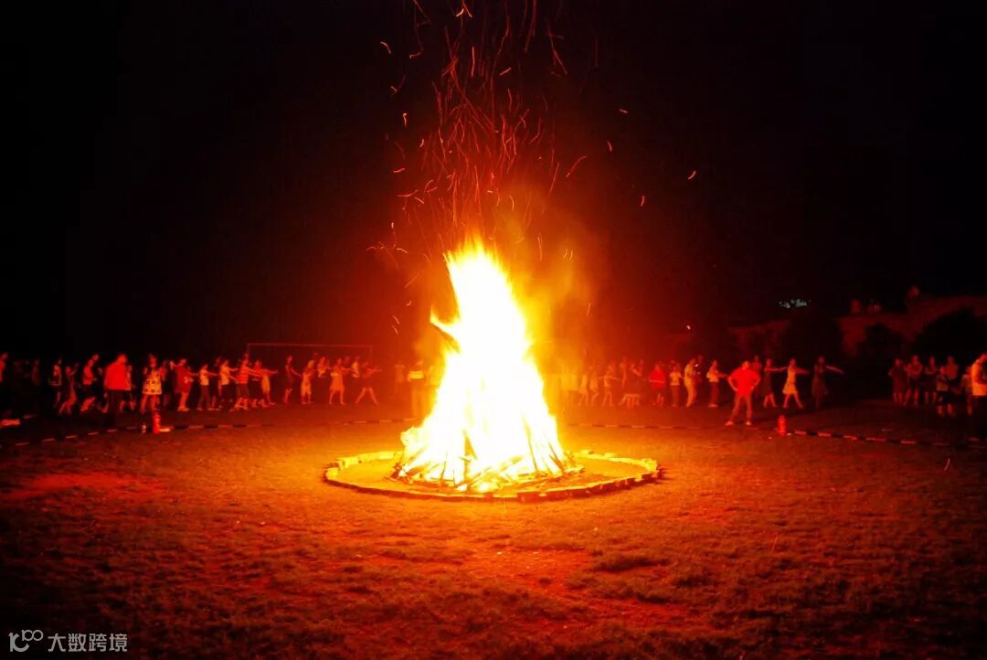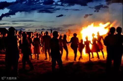 架起一堆木柴,熊熊燃烧的篝火代表着草原人民的热情和奔放,大家伙都手拉手围成了两圈,