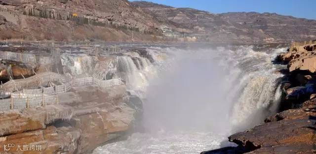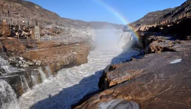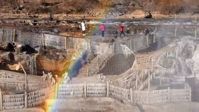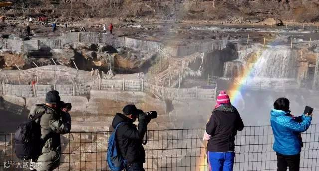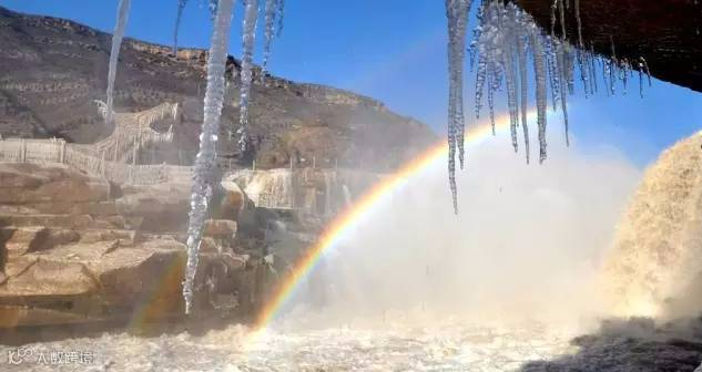 12月尾,受降温天气影响,位于山西吉县和陕西宜川县交界的黄河壶口瀑布出现冰挂景观,与瀑布上空飞舞的彩虹交相辉映,美不胜收。