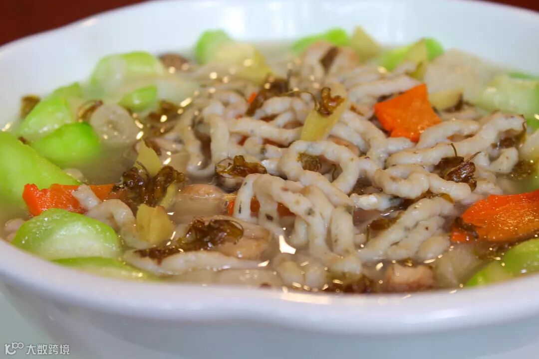 这个面可不是普通的面,而是用实实在在的鱼肉制成的鱼面。鱼面的制作极需耐心,去鲜肉之刺皮,剁其肉至泥酱状,加一定比例的淀粉、食盐揉搓成面,将面分成团后再经过一系列工序后方成。这道菜吃的不仅仅是味道,更是大厨满满的诚意。