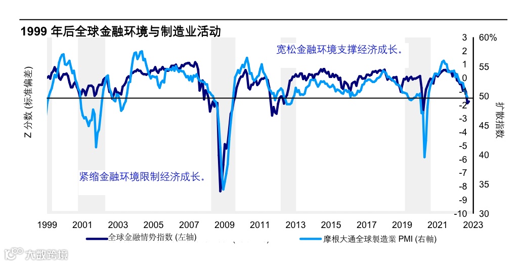 受各国央行影响的金融环境与制造业活动走势过去呈现高度正相关。具体而言,宽松金融环境有利于经济成长,紧缩金融环境不利经济成长。