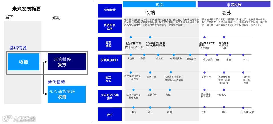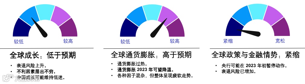 我们预期通货膨胀趋缓,市场开始期待央行于 2023 年第一季暂停紧缩动作,并维持至 2023 年中。这有利于经济复苏回温,全球成长仍低于趋势,但会开始加速,并展开新一轮经济和市场周期,带动风险资产表现领先。