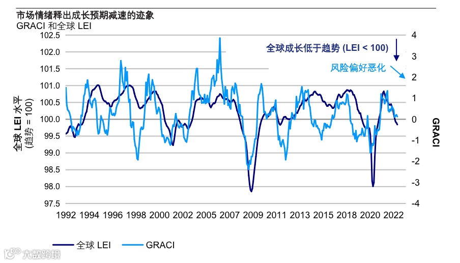 数据源:彭博信息、Macrobond。景顺投资方案研究与计算结果。景顺解决方案的专属领先经济指标。宏观经济数据截至 2022 年 10 月 31 日。领先经济指标 (LEI) 是衡量经济成长水平的专属前瞻性方法。全球风险偏好周期指标 (GRACI) 是衡量市场风险情绪的专属方法。