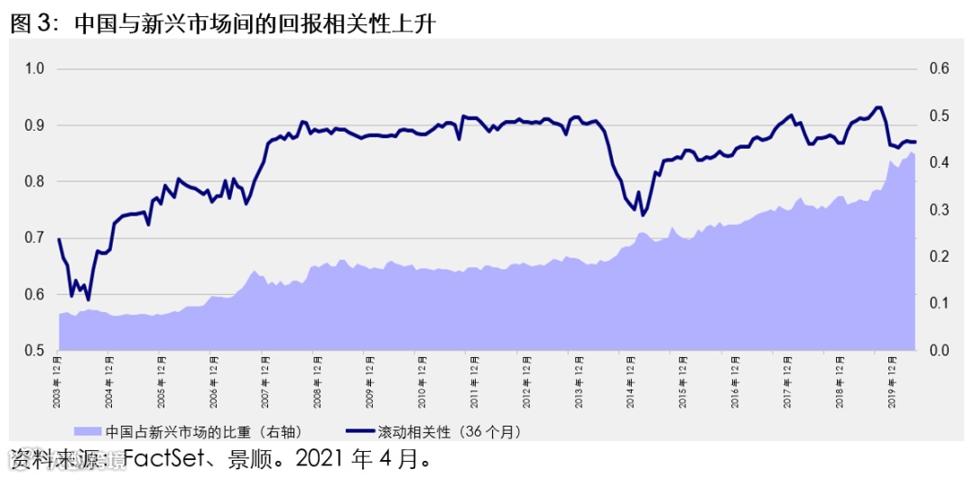 从指数的角度来看,近年来中国在明晟 (MSCI) 新兴市场指数中的地位越来越重要。其指数权重从五年前的 25% 以下增至现在的 40% 左右。鉴于中国经济增长速度加快以及明晟新兴市场指数纳入 A 股,我们预计其指数权重将继续上升。我们可以看到,中国和新兴市场间的回报相关性呈结构性上升,过去二十年中从 0.6 上升至 0.9 左右(图 3)。我们认为,一旦中国的权重超过一定门槛值,中国单一市场的股票几乎就可以等同于新兴市场股票。