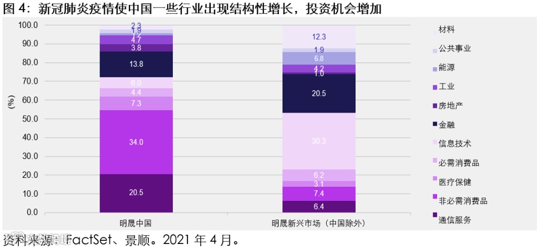与其他新兴市场相比,中国的通信服务、非必需消费品和医疗保健行业合计占明晟中国指数的 60% 以上,而只占明晟新兴市场(中国除外)指数的 17%(图 4)。其他新兴市场仍然以金融和材料等传统增长行业为主(以信息技术行业为主的台湾地区和韩国除外)。我们认为,行业构成的差异对独立中国配置至关重要。这为投资者提供了前瞻性的投资机会,特别是在新冠肺炎疫情使我们的生活和工作习惯产生了结构性变化的情况下。
