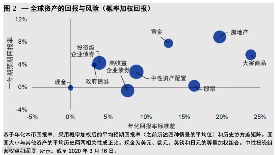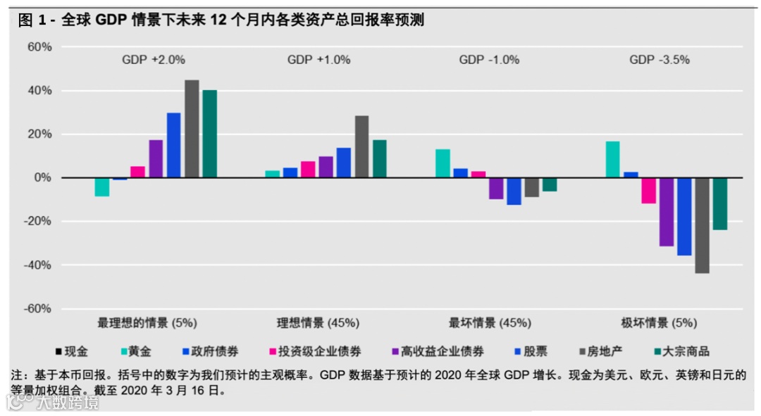 将上述情景转换为未来12个月的市场预测也许更为直接。在最理想的情景下,我们认为未来12个月标准普尔500指数将为3000,黄金价格为每盎司1325美元,布伦特原油价格为每桶45美元。而在极坏的情景下,标准普尔500指数将为1400,黄金价格为1750美元,布伦特原油价格降至20美元(接近2020年3月18日下跌的水平)。