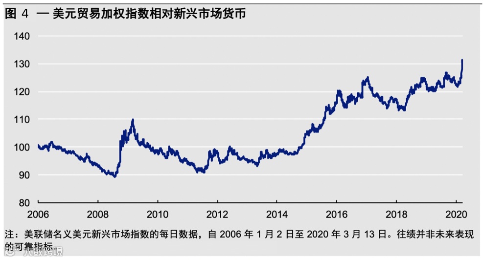 尽管优化结果显示政府债券的中性配置为30%,但我们决定维持在20%的减持水平。这在一定程度上是因为今年政府赤字可能大幅上升,导致在发达国家收益率处于历史新低时债券供应增加。鉴于对发达市场的收益率差增大,新兴市场货币走弱(见图4),我们仍看好新兴市场债券。