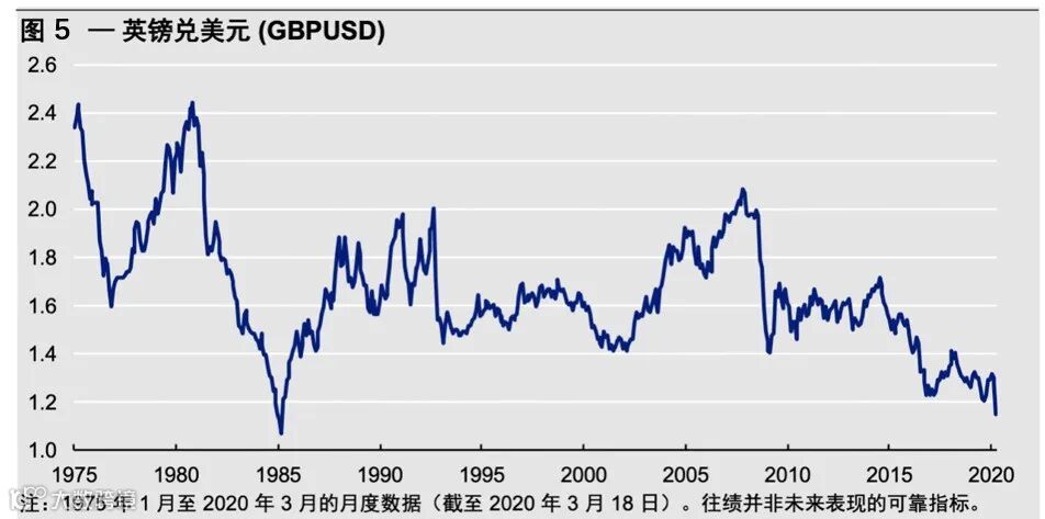 我们看好英国股票的原因略有不同。从消极的方面说,英国经济受脱欧影响已被削弱,而且脱欧带来的消极影响今后还会继续。也就是说,疫情来袭前英国经济已经出现下滑。此外,资源类股票英国主要股指中占据重要地位,油价暴跌使得英国经济雪上加霜。而且英国经济高度依赖金融业,金融市场的动荡会对银行和保险公司的情绪造成负面影响。然而英国股息率超过6%,英镑暴跌(英镑兑美元于2020年3月18日跌至1.15—见图5)。受到多重打击后的英国股价持续走低,而英镑的疲软有助于保值海外收益。因此我们满仓持有英国股票。