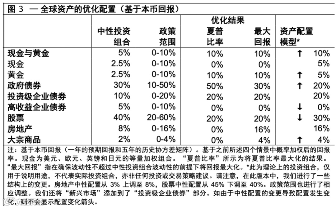 优化结果表明应采取杠铃投资法,一端是防御性的黄金、政府债券和投资级债券,另一端是波动较大的房地产和大宗商品(股票则采用政策范围内的最低比例)。