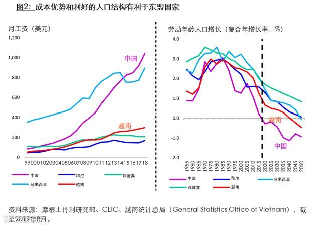 我们估测2020年这一趋势将有所加速,其中具有人口和成本优势的国家将成为最大的受益者。我们认为东盟国家,尤其是越南,将成为供应链转移的主要受惠国家之一。越南工资仍远远低于中国(图2),但劳动年龄人口增长普遍更高。尽管如此,我们相信,受益于研发投入的增加、人力资本的改善、高效的供应商生态系统和良好的基础设施,中国在高附加值行业仍具备关键优势。