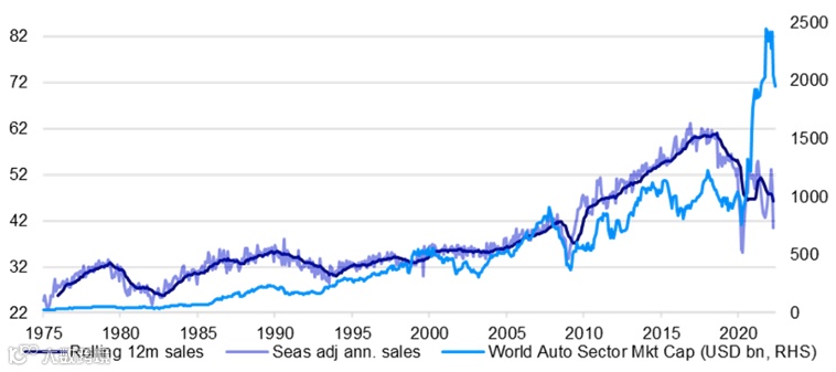 图⑩:全球汽车销售额(百万)和汽车股的市值