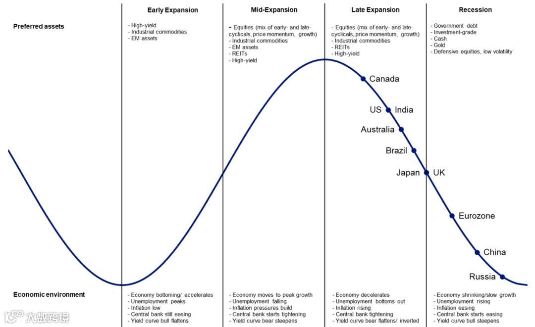 注:图中标注了全球经济周期的示意图,以及我们对全球最大经济体周期性定位的看法。