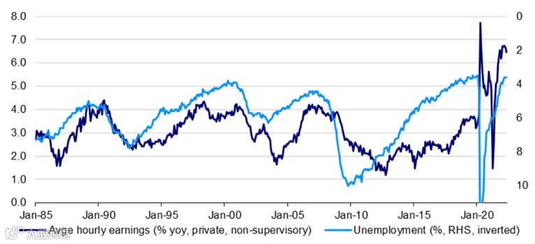 劳动力市场紧张的情况下,工资增速加快,但美国数据表明近期有放缓现象