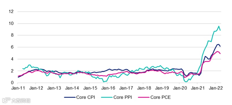 注:2011年1月至2022年4月的月度数据。通胀的“核心”指标不包括食品和能源项目。CPI是消费者价格指数。PPI是生产者价格指数。PCE是个人消费支出,其核心版本深受美联储的青睐。