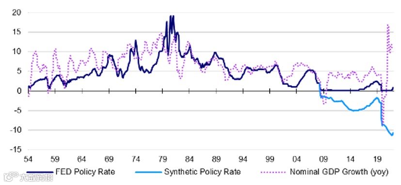 “综合政策利率”是考虑到美联储资产购买而调整的政策利率(使用经验法则,即每1500亿-2000亿美元的资产购买相当于政策利率下调25个点,正如美联储主席伯南克在2011年3月向国会解释的)。