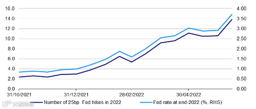 注:基于2021年10月31日至2022年6月15日的双周数据。“联邦利率”是联邦基金政策范围的上限。计算结果由彭博社提供。