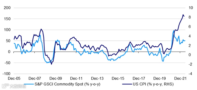 图⑧显示了商品价格通胀和美国总体消费价格通胀之间有明显关联(鉴于CPI的一些组成部分是商品,这相当正常)。