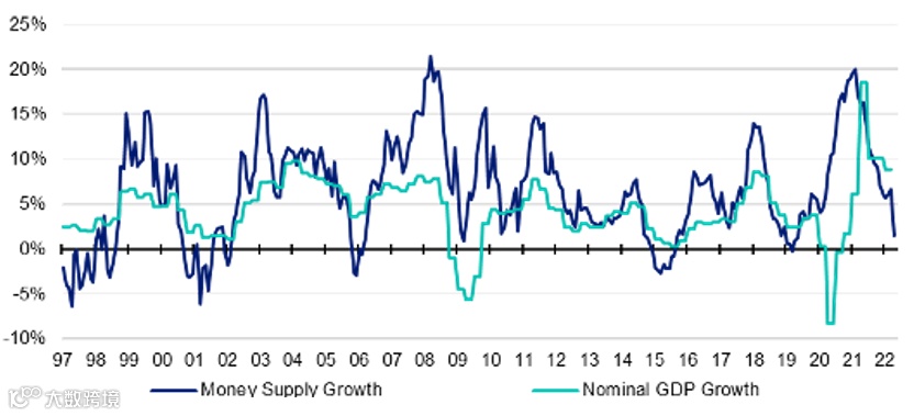 我们使用汤森路透国际可比经济指标对美国、欧元区、中国、日本和英国的货币供应量和名义GDP进行美元汇总。我们的货币供应量指标中,M2指中国和美国,M3指欧元区、日本和英国。