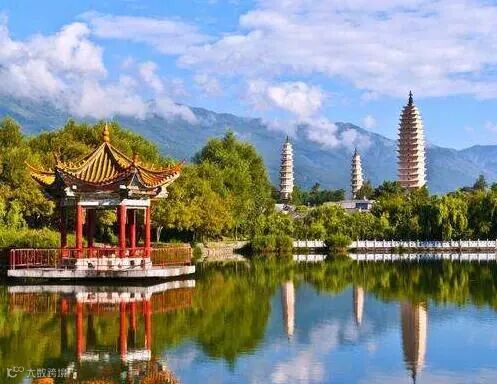 三塔倒影公园位于崇圣寺三塔以南1公里处,公园坐北朝南,背靠三塔以园内的潭水能倒影三塔雄姿而得名。