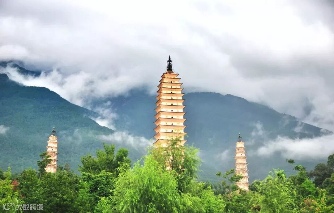 三塔由一大二小三阁组成。大塔又名千寻塔,当地群众称它为“文笔塔”,通高69.13米,底方9.9米,凡16级,为大理地区典型的密檐式空心四方形砖塔。