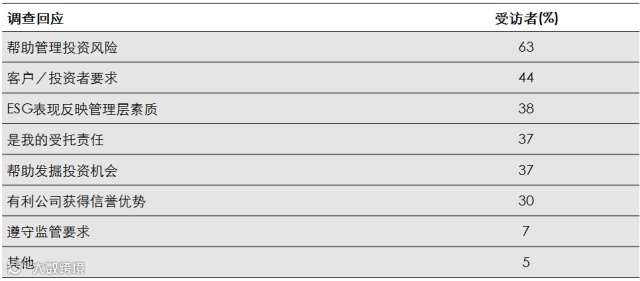 近日CFA协会(CFA Institute)进行的调查反映投资管理业面对考虑ESG因素的压力(见图1)。考虑ESG议题主要由于其可帮助管理投资风险。这些风险可能是业务风险,即公司的资产价值或盈利能力因违反ESG标准而下跌;会计违规事件的风险;或者公司股票价值被低估的风险(例如市盈率偏低)。
