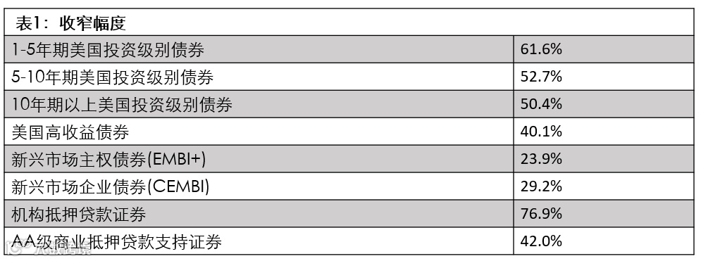 资料来源:ICE美银美林1-5年期美国企业债券指数、ICE美银美林5-10年期美国企业债券指数、ICE美银美林10年期以上美国企业债券指数、ICE美银美林美国高收益债券指数、摩根大通新兴市场债券指数加主权息差、摩根大通新兴市场债券指数综合息差、彭博巴克莱美国抵押贷款支持证券固定利率平均期权调整息差、ICE美银美林AA级美国固定利率商业抵押贷款支持证券指数。