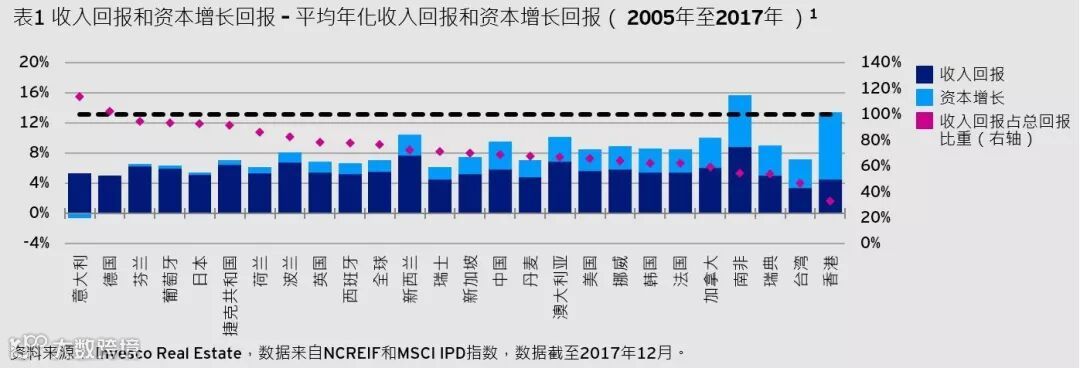 稳定的收入回报是投资者青睐于房地产的原因之一。从全球来看,收入回报占私人房地产总回报的比重通常很高。除南非和香港等少数高增长市场以外,年化总回报主要是受收入影响(表1)。