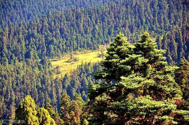 林海由两侧青山中的灌木丛和茂密的云杉、松树组成,树木以青冈为主