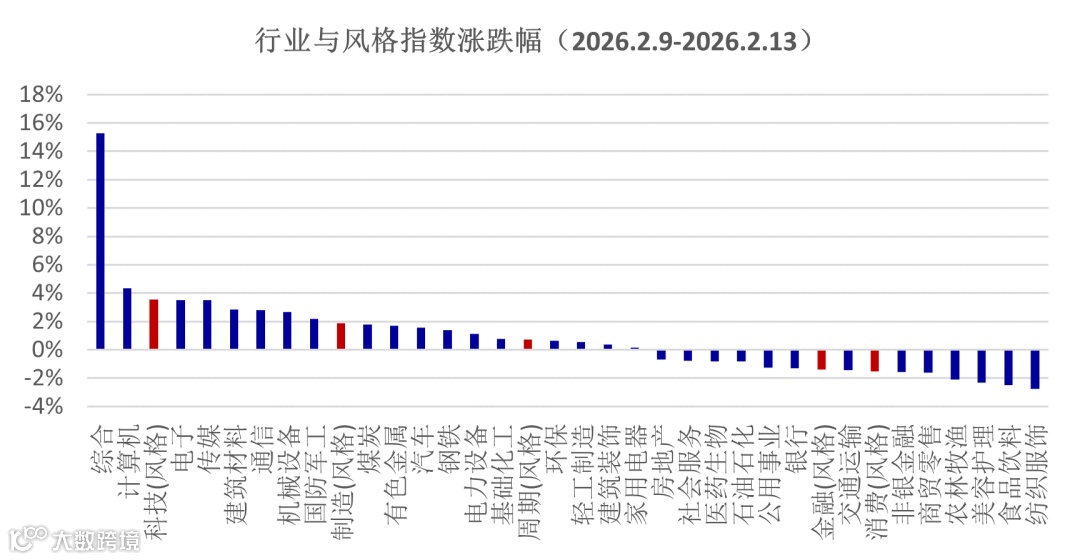 从指数的表现分析,市场呈现出对2月前期表现的修复,而非避险;如果是避险为主,则蓝筹和价值板块有望表现更好,而节前市场呈现出科技风格表现更强的特征;再观察2月13日,即节前最后一个交易日,当天上证50和沪深300指数跌幅分别是1.5%、1.3%,而科创50和科创综指分别下跌0.2%、0.4%,市场仍然呈现科技板块表现更强的特征。