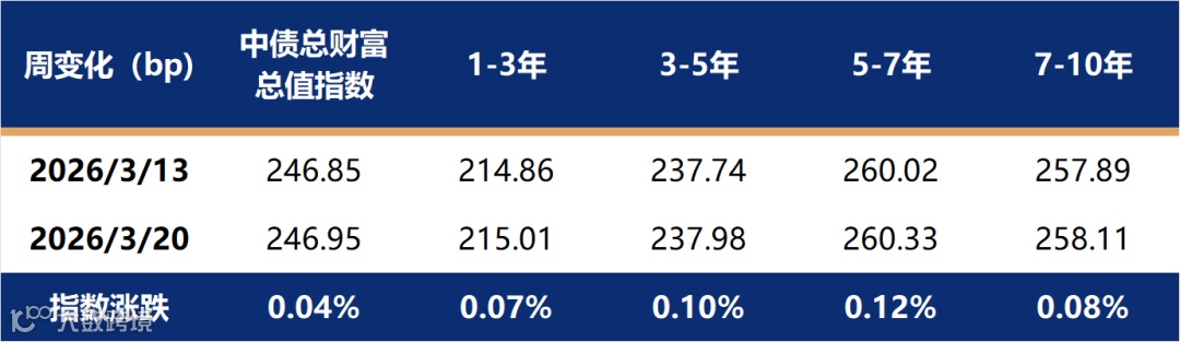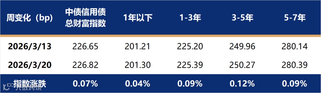 上周,信用债收益率小幅下行,中债信用债总财富指数微涨0.07%,其中3-5年指数涨幅较大。