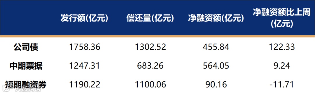 非金融企业短融、中票、企业债、公司债发行量、偿还量、净融资额(与前一周比较)。