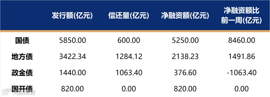 国债、国开、政金债、地方债发行量、偿还量、净融资额(与前一周比较)。
