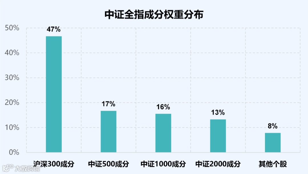 从表格中,我们可以看出,中证全指有接近一半的权重为沪深300指数成分,另一半的权重则为中证500、中证1000、中证2000及其他中小市值个股。